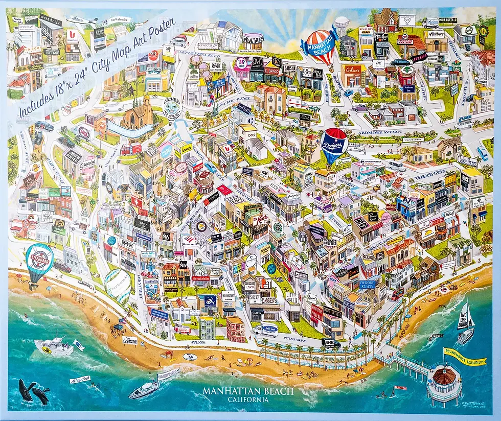 In the winter of 2004, amidst snow and ice, we created our very first hand-painted map of East Hampton, New York. Our company then moved to the West Coast in California a few years later, starting off in Humboldt. In 2013, the first South Bay Art Map was painted for Hermosa Beach.